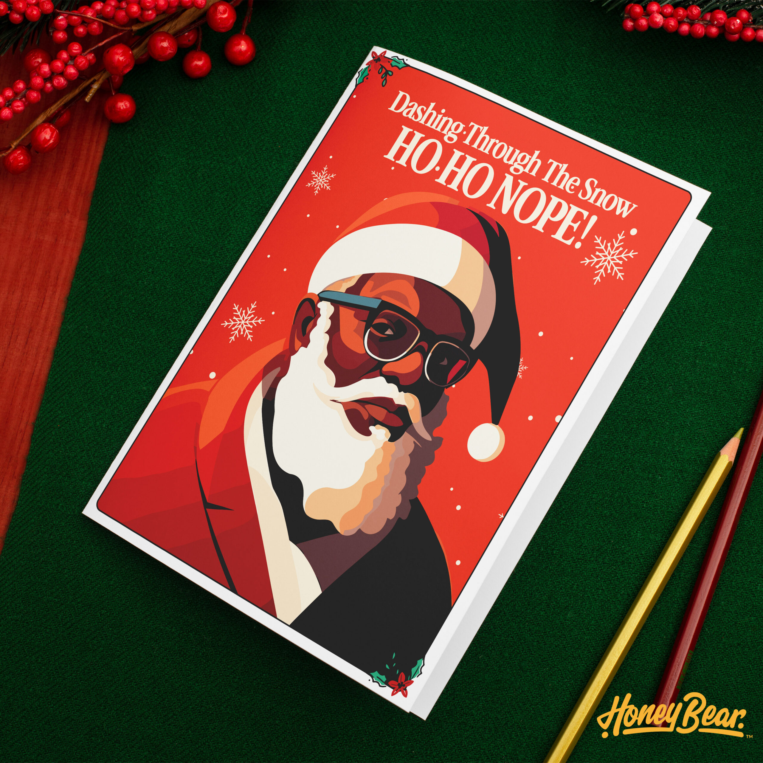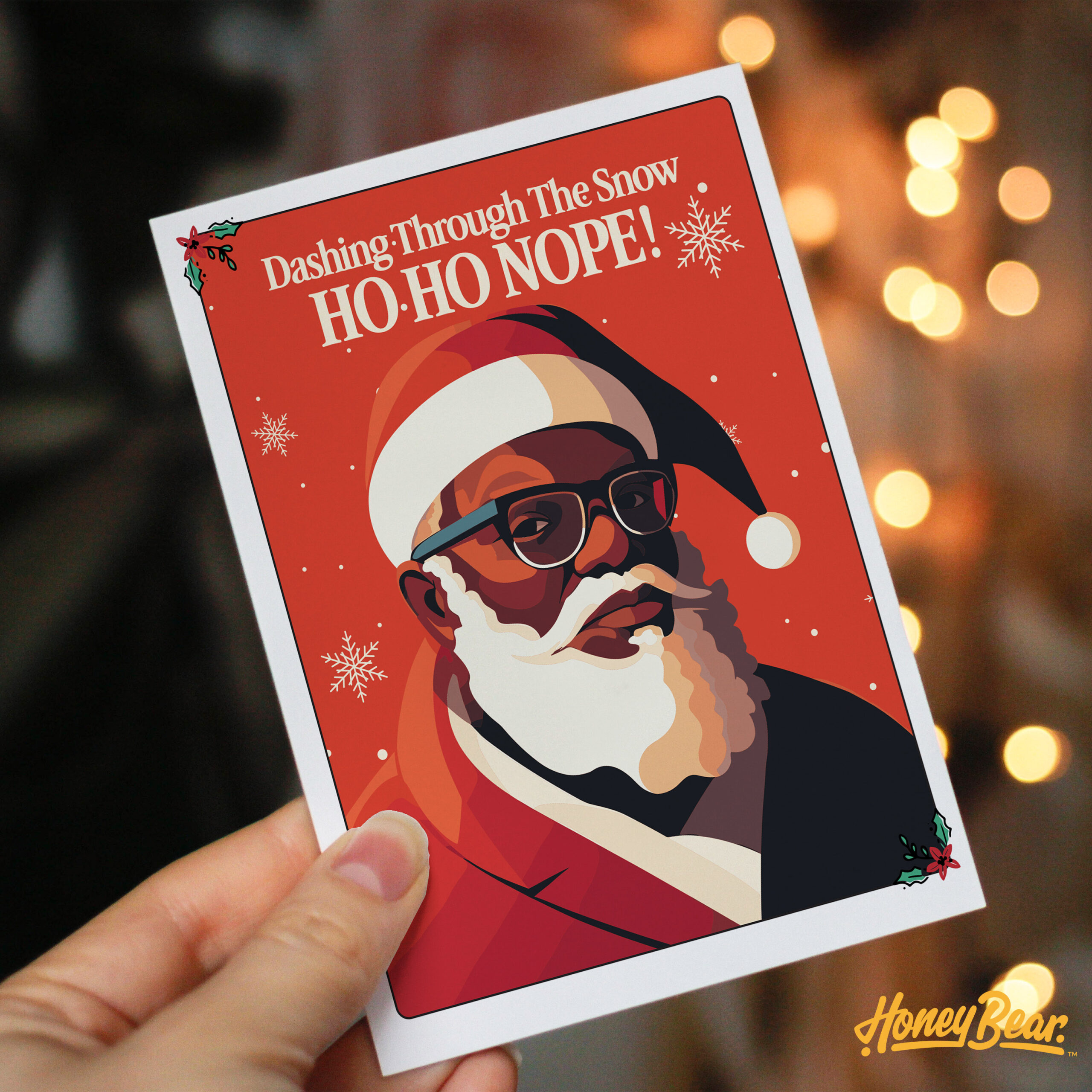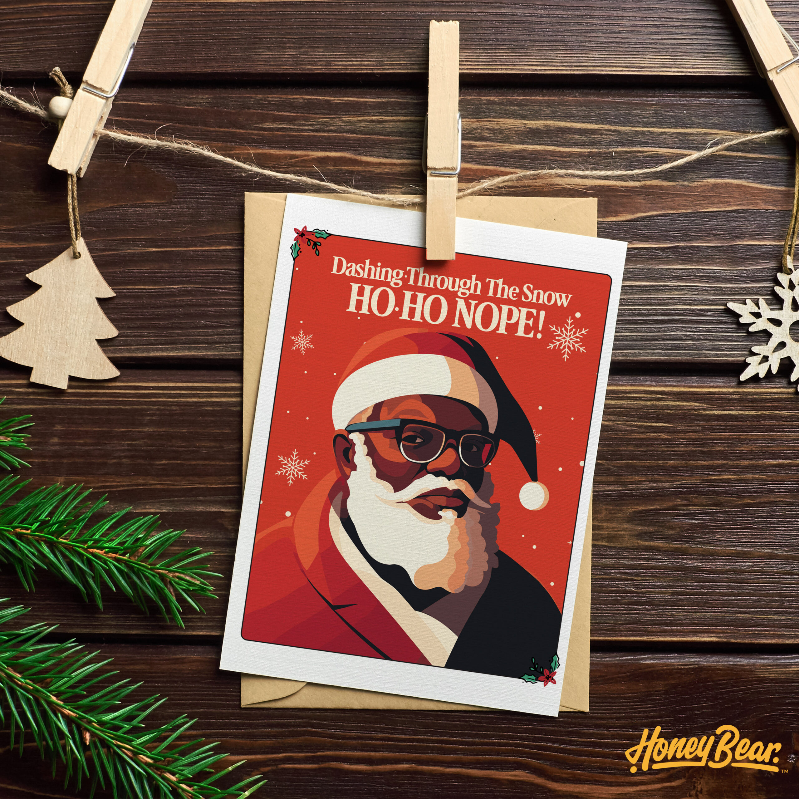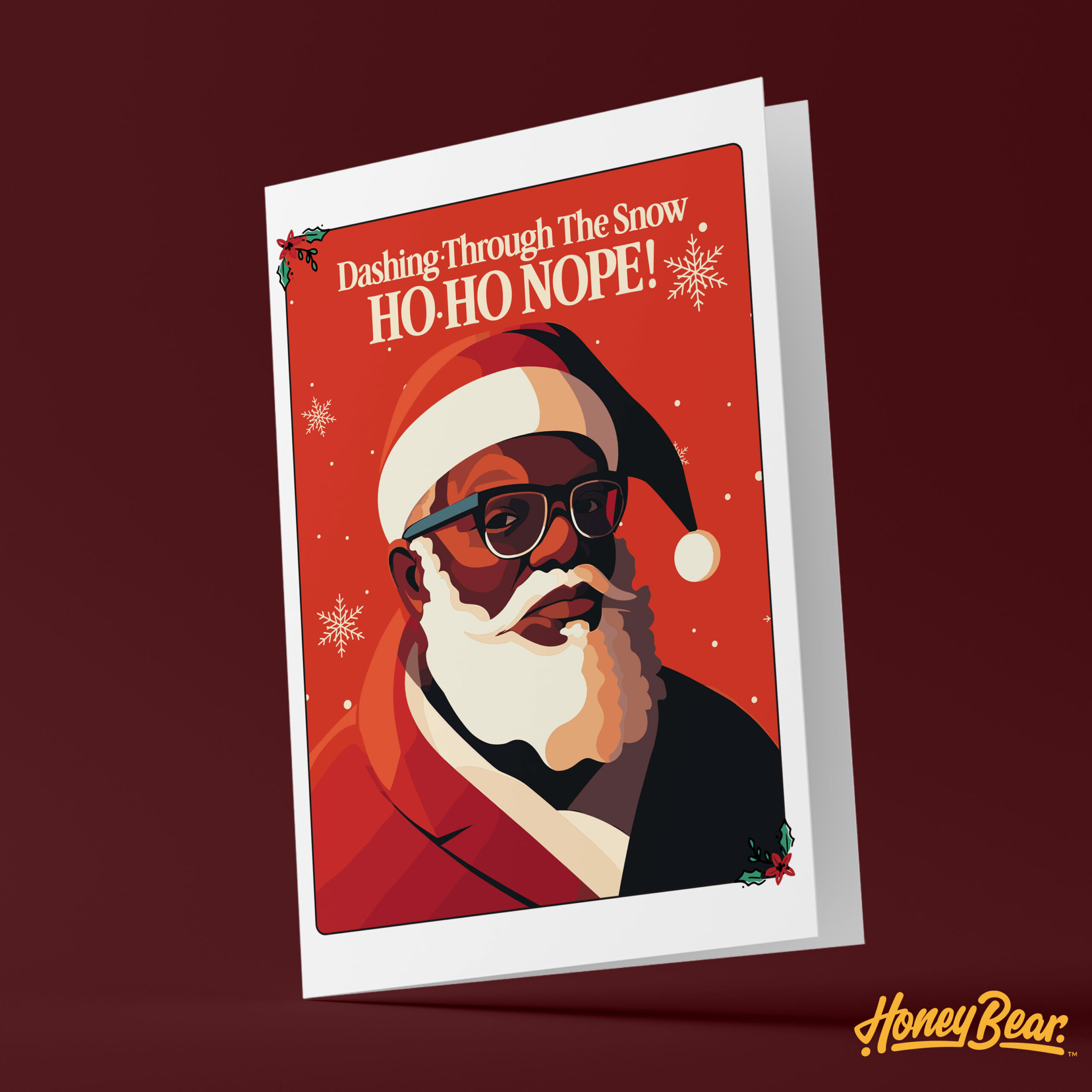 Celebrate the holidays with our “Dashing Through the Snow, Ho Ho Nope” Black Santa Greeting Card—a joyful twist on seasonal cheer! This 4.25 x 5.5-inch (A2) card, exclusively designed by Honey Bear Co., features a charming Black Santa to bring warmth and inclusivity to your holiday greetings.